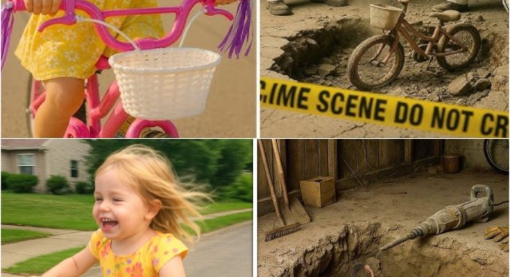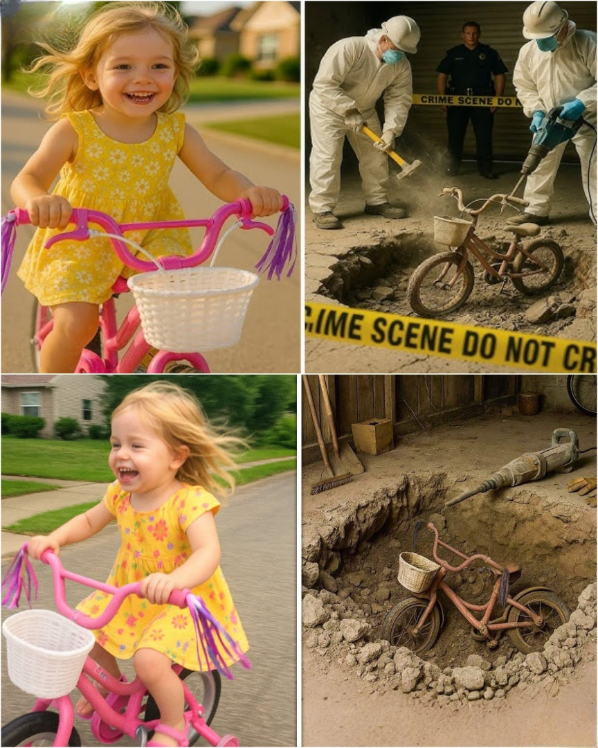 Heart racing, Laura followed Harland to a rental property on Oakridge Road—a house she passed every day. Police cars and yellow tape surrounded the garage. Renovation workers had been breaking up concrete for plumbing repairs when their tools struck something hidden beneath the slab. At the bottom of a freshly dug pit lay a small pink bicycle, caked in dirt, its faded streamers still fluttering slightly in the breeze.