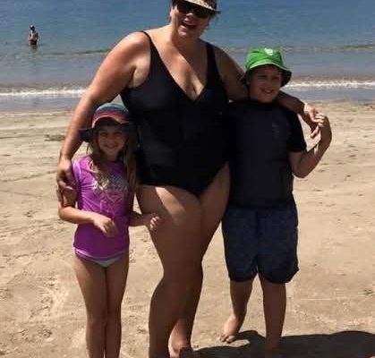 In a powerful moment of liberation, she asked her husband—whom she lovingly calls “The Pants”—to take a photo of her and the children as they enjoyed their day at the beach.