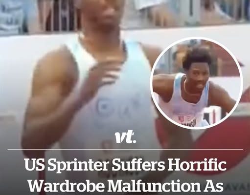 An American sprinter suffered a shocking wardrobe malfunction as his “manhood” fell out of his shorts during a race.
